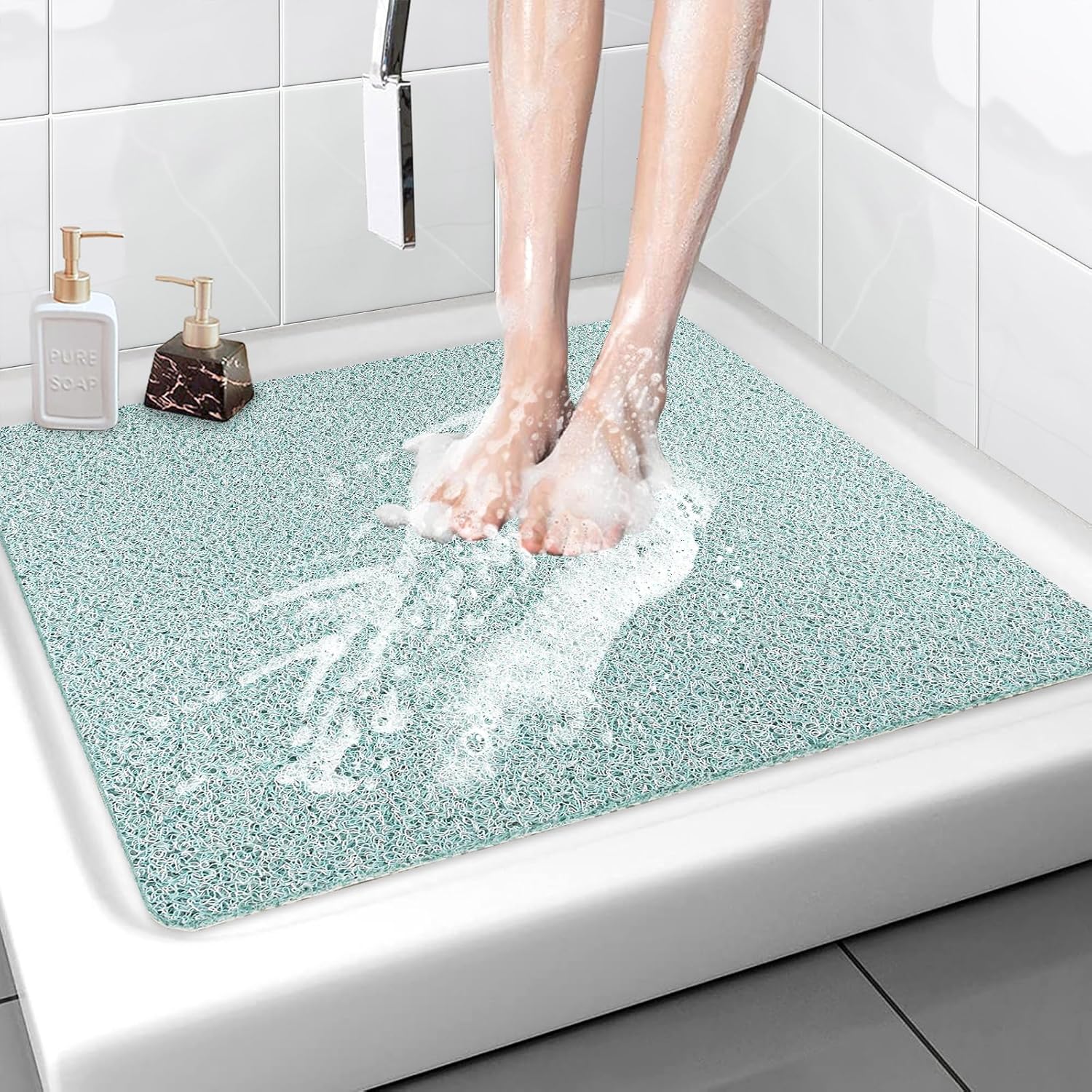 Enjoy comfort and softness in the shower, the hollow PVC shower mat is not only non-slip but also provides comfortable support, away from the hard and cold ordinary bathroom mat, and brings your feet nice massage experience while showering Shower mat non-slip without suction cup is an essential safety measure in households with young children or the elderly. Ideal for shower room, bathroom and anywhere floors are wet. All season universal, best choice for your private home The braided material that allows water to flow through easily, easy to clean & quick drying. They are soap scum resistant and quick drying, leaving no residue on shower tray. Our shower floor mat will last for a long time and won't rot as fast as ordinary mats